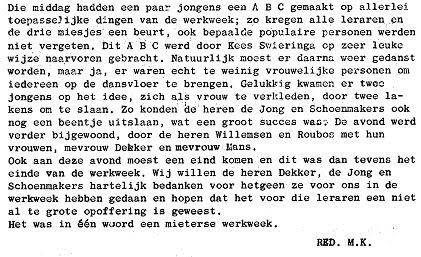 Op de voorste rij leden van het schoolbestuur. Op de tweede rij zien we o.a de heren Schoenmaker, Verdaasdonk, Knoppers, Beets, Rozendaal, Moorrees, Dorsman en Fie Winter en Jaap de Lange en Van Eynthoven.
